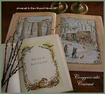 In March the library at Corgyncombe displays some of Tasha Tudor's March delights. In "A Time to Keep" Tasha Tudor illustrates a sap house and sugar bush with a family partaking in the annual tradition of gathering sap. Pussy willows and red-winged blackbirds surround the drawings. I love to hear the red-winged blackbird, it reminds me that spring is coming. The book in the foreground, with the birds perched on pussy willows and the mouse, is "Wings from the Wind", a collection of poetry.